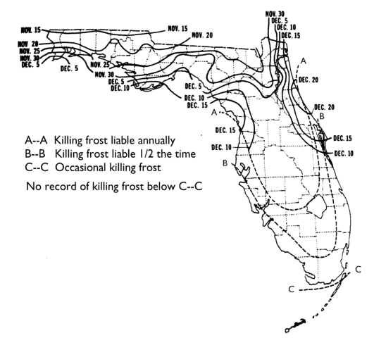 Average dates of first killing frost during Fall in Florida